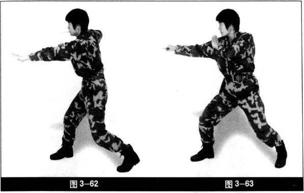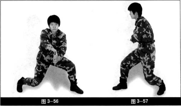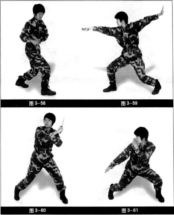 左手抓握刀靶右手换反握匕首目视前方(图3-56)身体右转两手收于身体右侧两腿微屈(图3-57、图3-58)。右腿向前上半步左脚