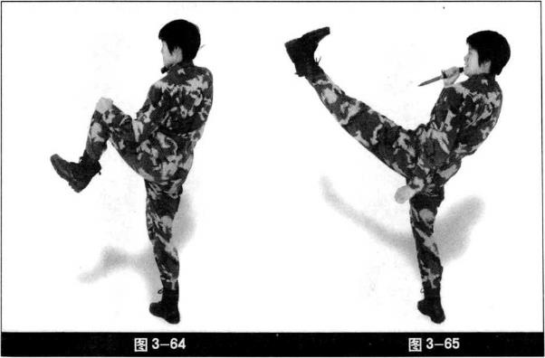 右脚脚跟向前拧转左腿提膝上抬脚掌朝前右手放于下颌刀尖朝后左拳自然下摆目视攻击方向(图3-64)。左腿向前上方直线蹬击,膝关节挺直力达脚跟(图3-65)。左脚收回落步左臂向左横格挡右