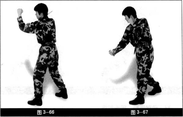 手位置不变(图3-66)。右脚跟步脚跟稍外摆身体左转右手匕首由后至前快速刺出左拳护于下颌目视攻击方向(图3-67)。