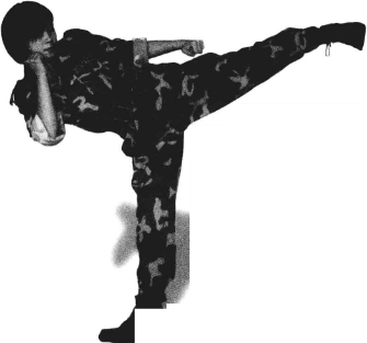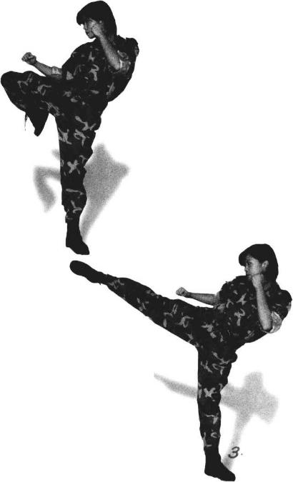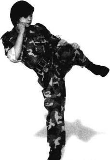 由大腿带动小腿由右下向左上侧弹踢出脚面绷直力达脚背至小腿下端(图3-23)。击出后膝关节挺直的瞬间迅速屈膝收腿落步成格斗姿势。
