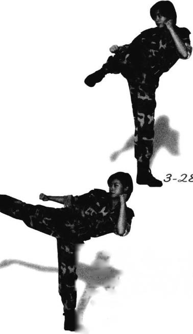 3-63-62右侧踹腿在格斗姿势的基础上身体左转左膝微屈右腿屈膝上抬(图3-27)。2右侧踹腿在格斗姿势的基础上身体左转左膝微屈右腿屈膝上抬(图3-27)。