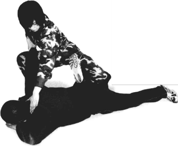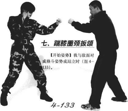 敌脚踝左腿从敌右腿上迈过迈步时我左膝窝需要与膝窝贴紧(图4-130)。下蹲左手按压敌后颈或后脑部,右手准备击敌头部将敌制服(图4-131)。6 4-1324-132我右手将敌右手臂向上提左手虎口向下按压敌后颈。而后可进行搜身、捆绑、押解、带离(图4—132)4-1324-132动作要点横移步接抱腿要快、准确垫步绊腿要协调敌倒地后控制要迅速。