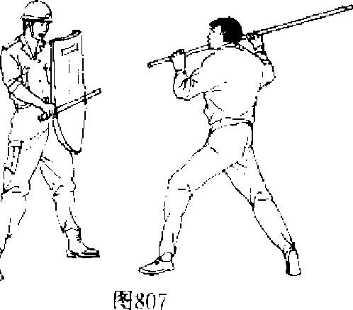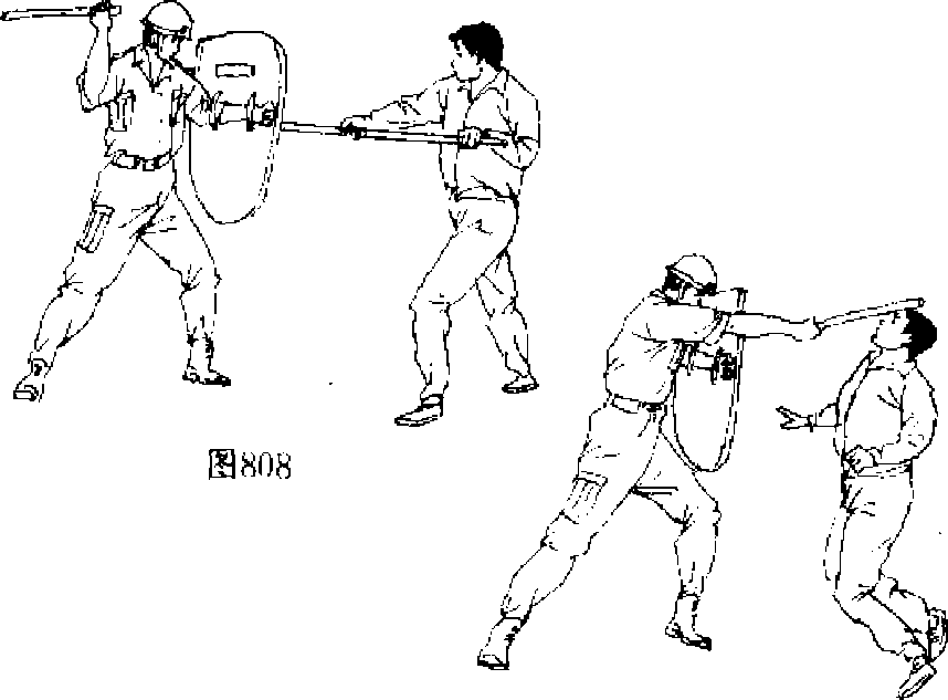 面部(图811),将敌擒服或击瘫在地面部(图811),将敌擒服或击瘫在地图)9图)9迅速用左手盾牌向左外格挡,以盾牌防左将敌重击瓦解寸同时我两腿微屈以保持前冲的势头将短棍猛然挥起(图808),重重砸向敌头部(图809),迅速抬起右脚用正踹腿重创敌裆部或小腹(图810)在顺势落稳右脚的同时迅速将妲警棍狠狠刺向敌咽喉或
