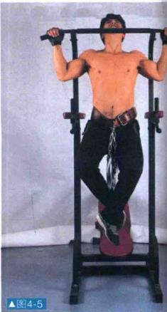 动作详解训练者系好负重两手抓单杠握距宽于肩。用力