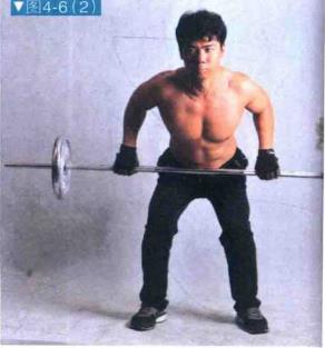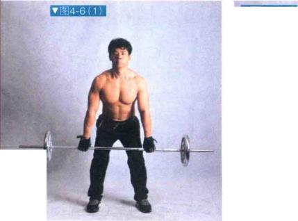 略宽于肩。采用硬拉动作将杠铃拉至腰部高度同时背部挺直(不