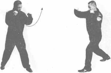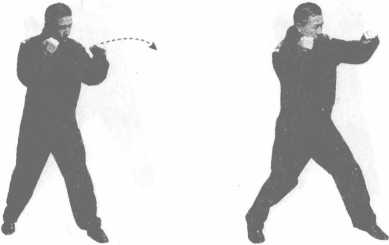 以右格斗式势为例(图18),左手的平勾拳即是前手的平勾拳。拳背朝上,拳面内扣肘臂其角大约呈90。左右利用身体腰部突然转向的力量身体重心移到右脚并略向右侧转体30。左右左脚跟外转左腿、左髓向左蹬转力达拳面。右拳保护好下颌、目视对方快打快收(图19)主要攻击对方头部侧面。