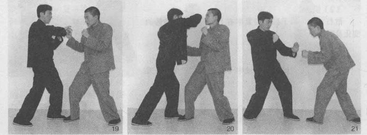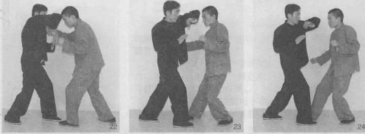 (1)动作甲方与乙方互相逼近乙方抢先欲发动攻势(图21),甲方盯住乙方反应在乙方靠近同时及时上抬左臂成盖肘盖打向乙方头部迫使乙方不能靠近(图22),未等乙方反应甲方动作不停右手肘一撤回同时发左盖肘盖顶乙方头部(图23、图24)(2)说明左右手盖肘发动连击要掌握好出击的时机、距离准确地实施狠击。第二节搐肘搐肘是以肘尖部由上而下搐落的肘法动作。即以前臂尺骨和肘尖部位沿对角线由上斜搐而落的肘击技术。搐肘和咏春搏击术其他技法一样在摆桩桩式情况下可分为前、后手搐肘技术。