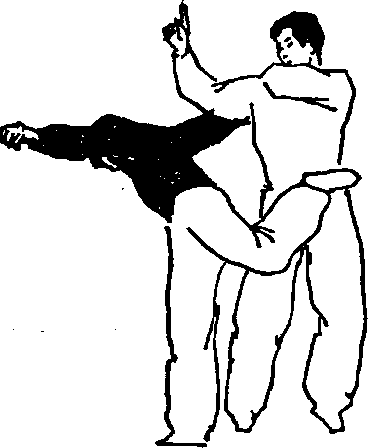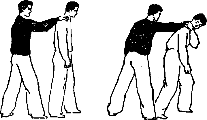 预备式甲乙同向站立乙在后上右步出右手抓住甲的右肩。如图102。动作一甲用左手向后翻卷按住乙抓肩的右手手背使其不能逃脱并前倾弓身拉直乙的右臂。如图103。图102 图103要点1甲用左手按住乙的右手要与自己的右肩上顶相配合以便牢牢按住乙的右手使其无法逃脱。图104图1042甲按住乙的右手并向前拉把乙的右臂拉直这是很关键的。如果乙的右臂没有被拉直下面的破法就困难了。图104图104动作二甲右转身上提右臂。此时乙急速左转身用左脚向后横撩击甲裆。如图14。要点乙左转身动作要快而猛左脚向后横撩的动作要果断有力。