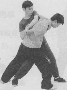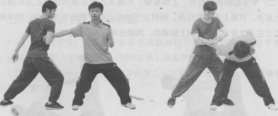 (一)乙撤右上左步成左弓步同时右臂将甲方右小臂夹于腋下左掌按于肘关节外侧右手按在自己的左手腕外侧。(图6、图7)图6 图7(一)甲方右脚上半步左脚撤步扣住乙方右脚同时左臂外伸用上体撞击乙方躯干。(图8)图8