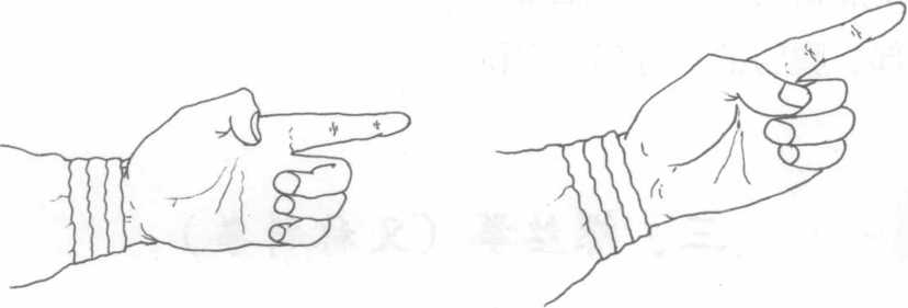 (一)手形握法食指伸直拇指弯曲紧贴虎口处其余三指的第二三节指骨弯曲并拢(图44)。另一种握法食指伸直中指、无名指和小指的第二三节指骨弯曲并紧拇指压在中指的指甲上。(图45)图44 图45图44 图45图44 图45图44 图45(二)要点食指要用力挺直、其余四指要用力弯曲扣紧。(三)用途用食指尖端可点击对方身体各处的穴位。