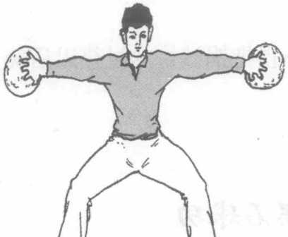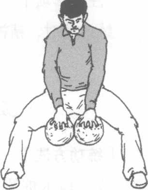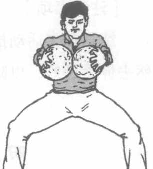 图65图65(第四章古今点穴练功方法一(第四章古今点穴练功方法一需特制石球两个(现在没条件制石球者也可用水泥掺沙自己制做两个球)根据自身手指的情况在石球上作五个眼儿不必太大能容手指为宜深度不要太深或太浅一般能伸进手指的梢节稍过或恰好为理想深度。练习者蹲好马步后两手慢慢将石球从地上抓起于裆前。(图65)