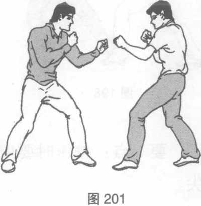 点击双方左格斗姿势站立(图201)对方用食、中指的指尖攻击我眼部时我左臂向左上方摆起格防(图202)。随即我右脚向左后方插步同时左臂肘关节挺直左拳变金枪指手形点击对方右章门穴(图203)