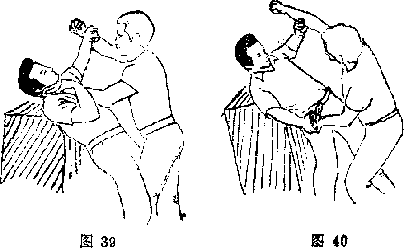 当对方用前臂压扼住自卫者的咽喉并挥臂准备由打时自卫者先抿挡住攻击的手臂然后再用这只孚向上伸抓对方的头发另一只手抬起用手措打击对方的咽喉。两手同时旅力使对方向侧后倒。见图37、38)