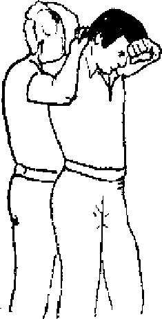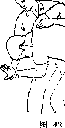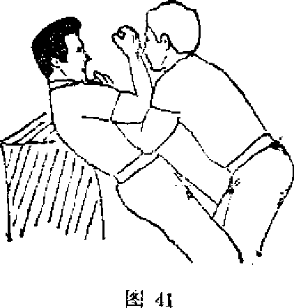 当对方双手臂下握颈得遑时自卫者立即将一只手背抵住前额向后推另一手向后伸抓住对方的头发向前拽头。由于对方头部的疼痛自卫者就可将其拽倒在地。(见图43)