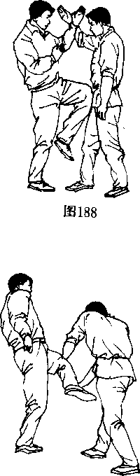 动作乙用左膝顶击甲腹部(图188)甲撤左步顺势弯腰用右手抄起乙左足踝,用左手按住乙左膝用力下压形成右抬左压之势反乙胯关节迫使乙就擒(图189)。要点撤步要快,动作协调连贯拿住乙后右抬左压双手合力用劲要整弯腰时侧身避开对方正面以防袭击。