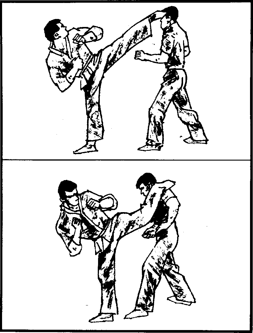 现对传统空手道中的勾踢也作了改进把它变成了针对对手某一部位的高踢动作。按照以前的方法,先是抬高膝盖然后以弧形勾的位置图9,不幸的是这样的方法也是使踢的动作易被发现并防守。但是如果整个腿部提高动作就更快且难于发现图10
