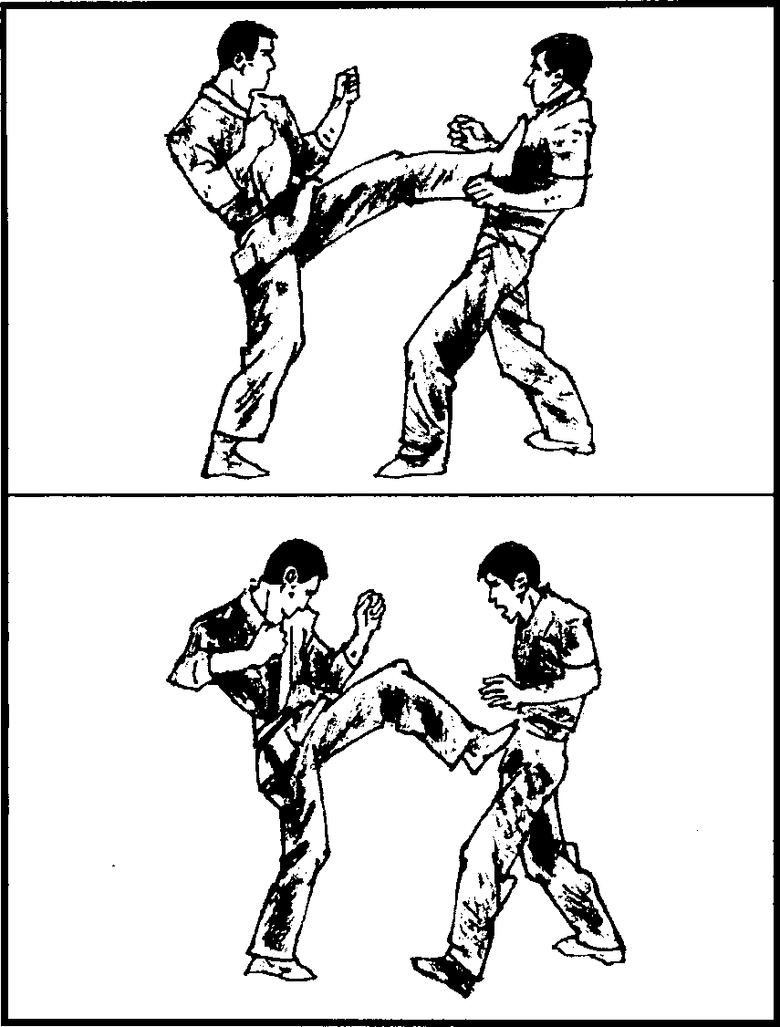 即使是传统空手道的前踢——在腿向前伸以前先应把膝盖抬起——在实战中亦是不同的。因为远距离的前踢却能取得很