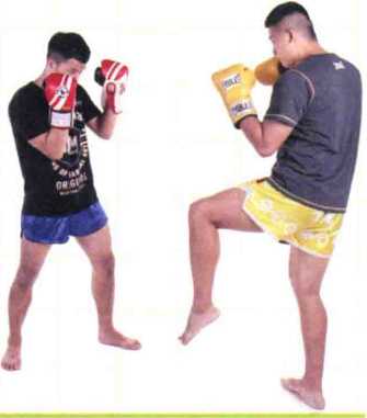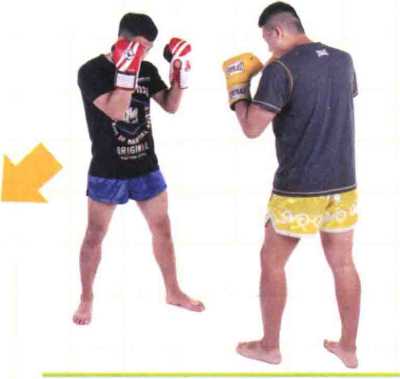 从实战姿势开始左腿在前右腿在后双拳与下颌等高正面面对对方站立。