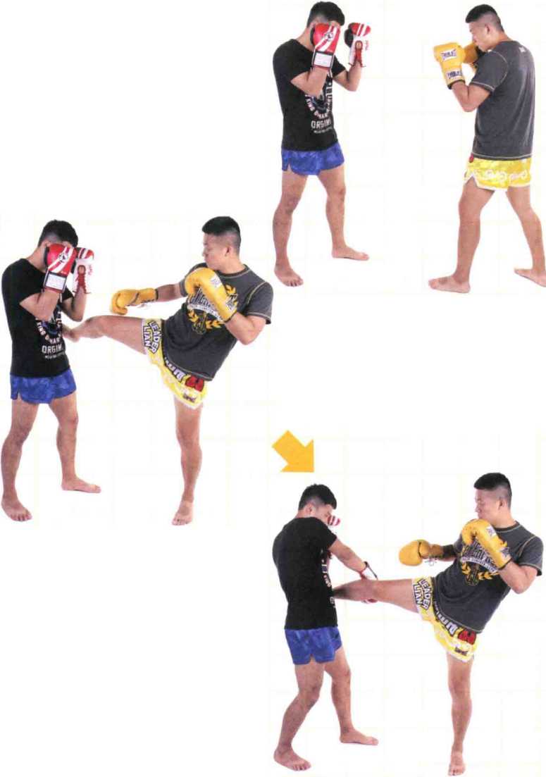 对方向上抬起右腿攻击使用右侧踢从右侧攻击我方腰腹部。