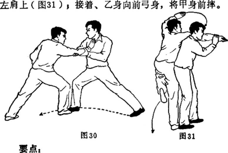 接上势当甲用右掌击打乙胸时乙急速含胸化解甲之掌势并以两手擒住甲之右臂(图30)上动不停乙急速再上左步向右后转身将甲右臂扛在此技为抱臂摔乙的抱臂、转身、扛臂、前摔要求动作连贯快速环环扣紧臂要抱紧不放前弓、抱摔一致,力猛易犯错误抱拉、弓身、前摔动作缓慢脱节臂抱不紧弓身前摔无力。教法,先练个人单练动作领会摔的动作要领再作双人对摔练习。