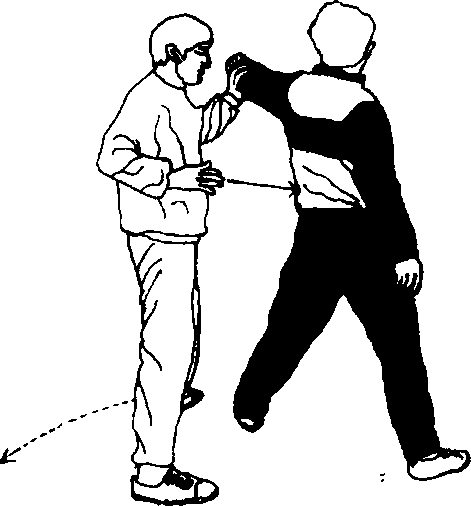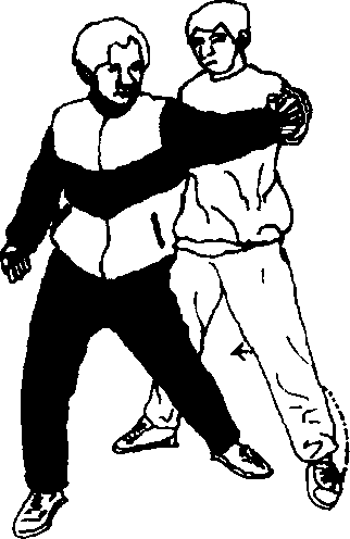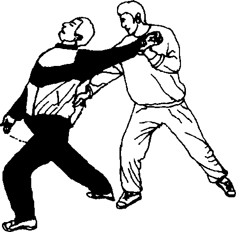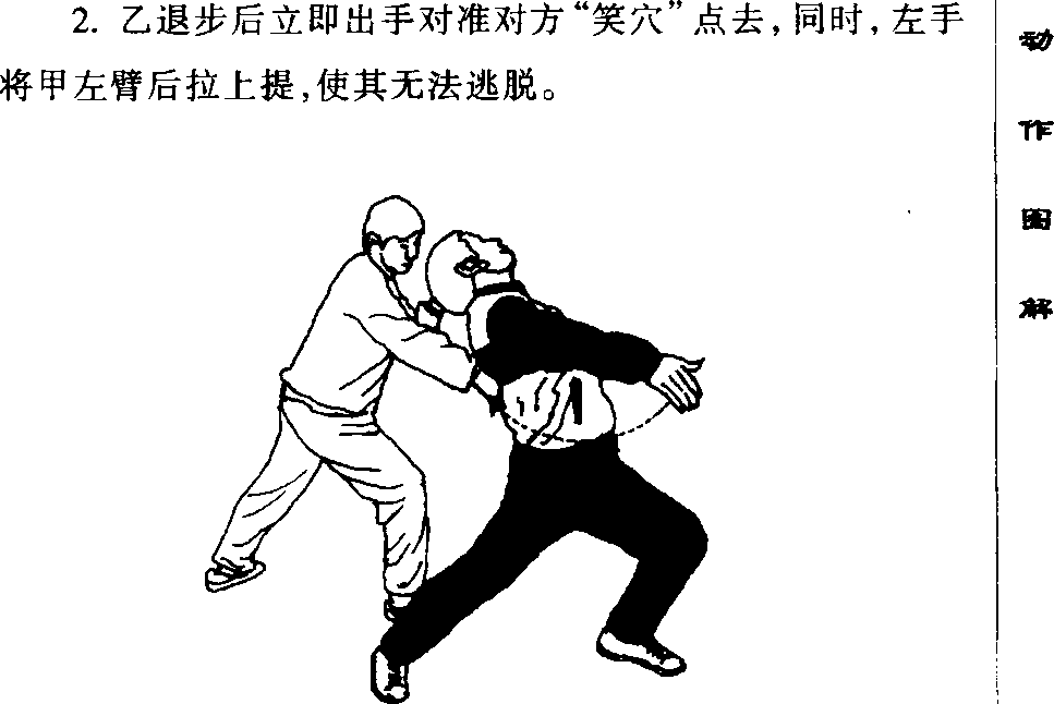 2乙以右脚前脚掌为轴抬左腿随身体继续左转绕向甲身后(北)落步成右弓步。同时左手将甲之左手微向上、向左后提拉。右掌速向前以大拇指点甲之腰部笑穴(相当于经外奇穴的肋头穴位下面在阴维脉范畴之内阴维脉连络着手太阴和少阴心经所云心气盈则笑肺气郁则哭。于下是哭穴)用此技不但能制服敌人而且可使敌人大笑不止(图242右侧、左侧)。