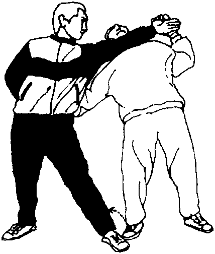 当乙用上技时甲左腿向右后绕撤半步以增加贯力急将身体左转左臂向左后方伸直贴于乙前胸部朝后挺滚即可化去乙头抵之法(图27正面、背面)。