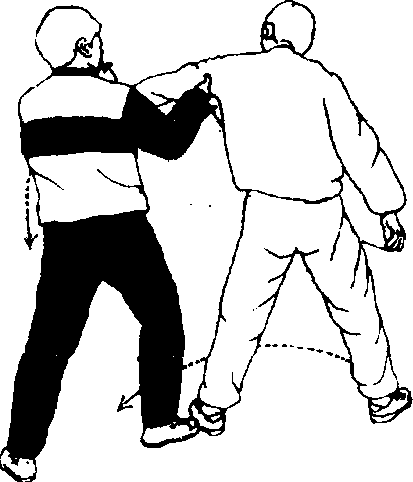 1 乙左脚由身后向右(西南)绕一大步右腿向后撤半步,速将身体向右后方闪退并用左手握拿甲之左手前臂左手心朝下虎口向右。右手臂弯曲由上往下与甲之左臂成十字形,并向外下压使甲之手臂翻转(图281正面、背面)