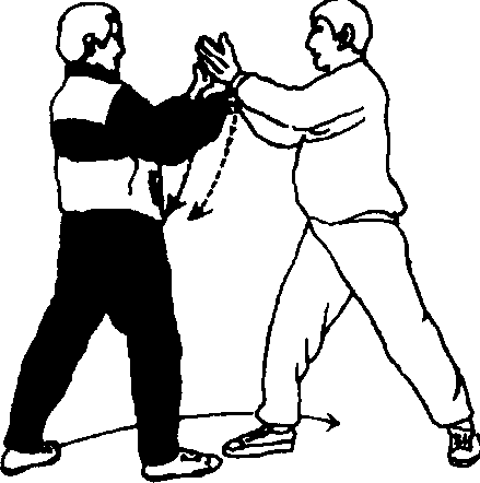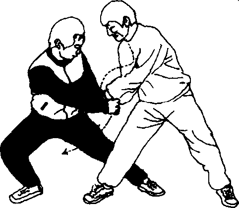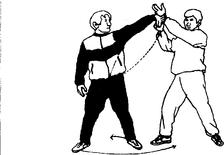当甲用上法时乙随即右脚从身前向左绕步落于甲左腿前脚尖外撇。接着以右前脚掌为轴右转身左脚顺势向左绕向身后(东)右腿微弓。同时右手随转身之势向左、向上绕行用大拇指压住甲左掌心食指根部其余四指拿住手背使甲腕部折向手背一侧即破上法(图34)。