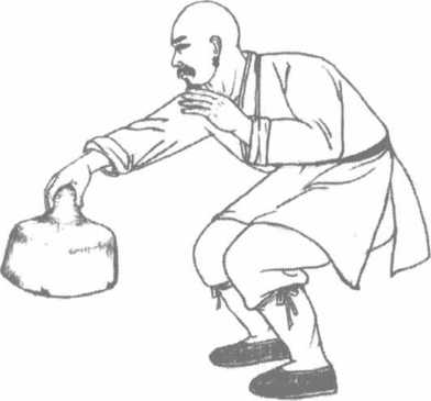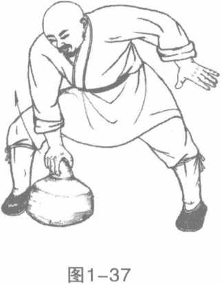 此法与前法稍异者并不渐次递加。此法入手即练较原有指力一倍以上之物以后加重亦以一倍为宜。广阔之处在下而锐端则向上练者以鹰爪手紧紧扣住其锐端相近之处用力上提。(图1一37、图1-38)