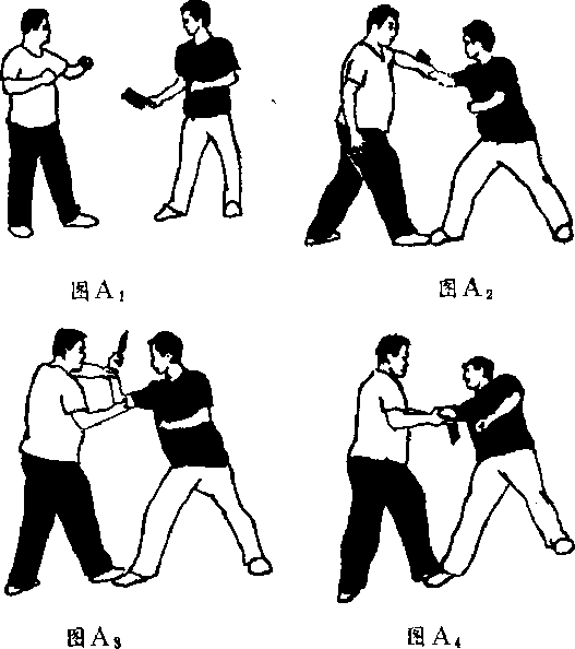 (1)攻防式开始目视对方乙右手握刀高举上右步向甲正面劈下甲立即撤左脚向左微侧身闪过刀锋同时出左手叼住乙提刀之右手腕部向外拧旋并向斜下牵动以起乙之重心(图2)