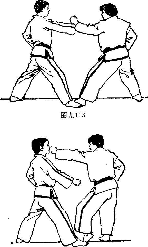 守方用左手刀虎口一侧外格对方的右拳接着左脚向前进步同时右手握拳以拳背击打对方的人中处(图九115116)
