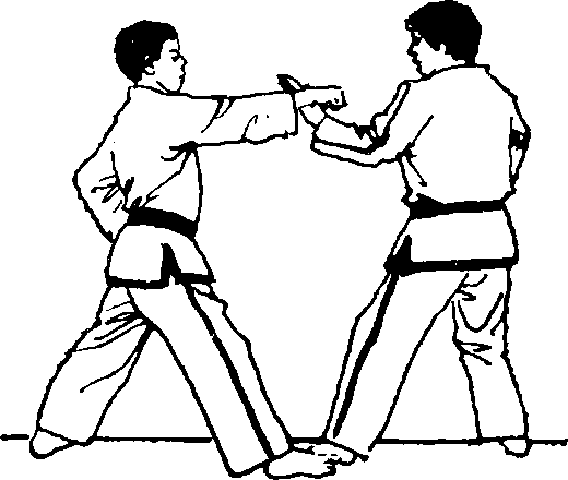 守方左脚回撤成左虚步,用左手刀外格对方的右拳接