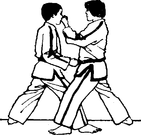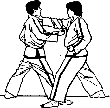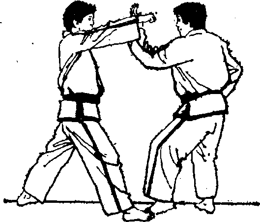 着再向前进步同时用右手掐击对方的咽喉部(图九