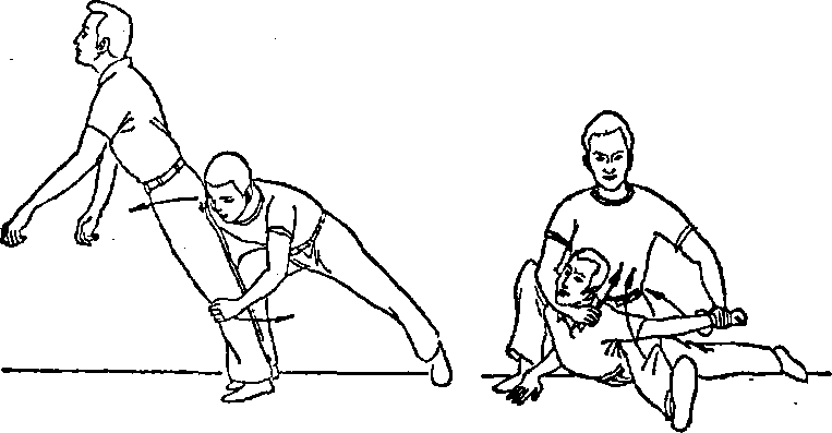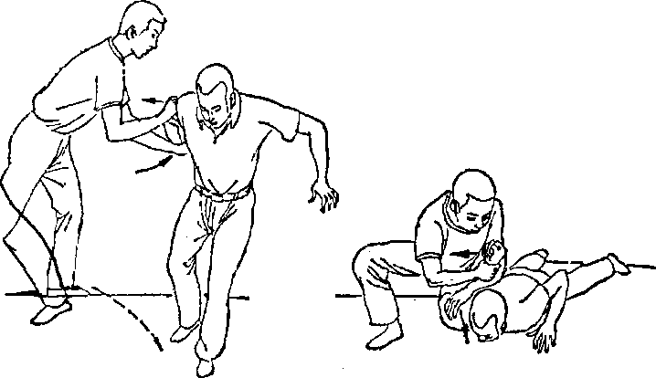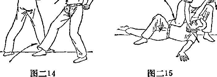 动作你由前接近对手右侧时左手虎口朝前迅速抓住其右手腕同时迅速上右腿猛绊其右腿右手猛扼其喉将对手摔倒(图二14),随即右膝跪砸其肋以擒之(图二15)
