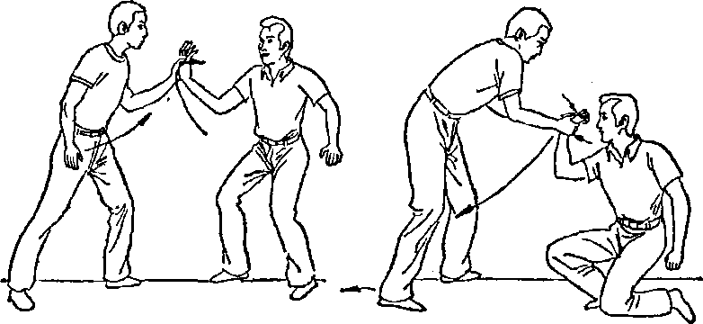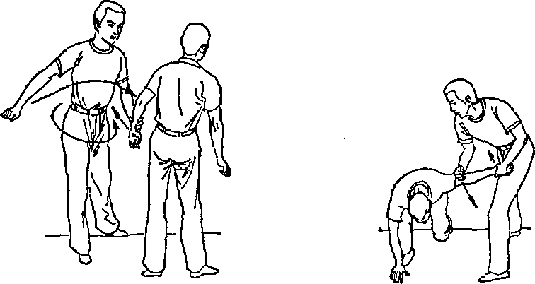 动作你从侧面接近对手身体右侧时迅速用左手抓提其右手腕(拇指卡其手背其余四指扣其手腕)随即向上抬并叠其腕向外拧(图二18)同时用右手同样握对方右手腕随后两手拇指同时向前顶叠其手背迫其下蹲(图二19)随即右腿后撤同时两手叠腕下压后拉