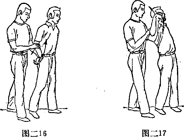 定对手腕关节其余四指扣压其手背并向上抬送其右前臂右手向下拉卡其肘关节(图二17)随后用双手将对手的右手夹制在左腋下以擒之。