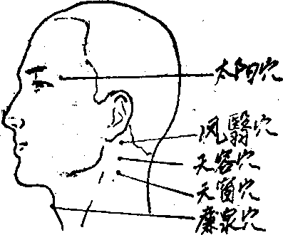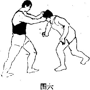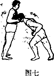 人的头部左右有太阳穴位于前额的两侧(图五),通前脑此部位一旦受到轻微击打即导致脑部晕昏甚至死亡。但是太阳穴比其它穴矩下手并只能从前面拿不能从后面拿。前面拿则对方易发现而事先预防或闪避。可用46的方法虽少但还是有的如当对方用头进攻我胸部时(图六),我即右腿后退一步用左手抓发按击对方买部同时右声拿按太阳穴,大拇指按在右太阳穴上中食二指按在左太初穴上运气用力拿(图七)