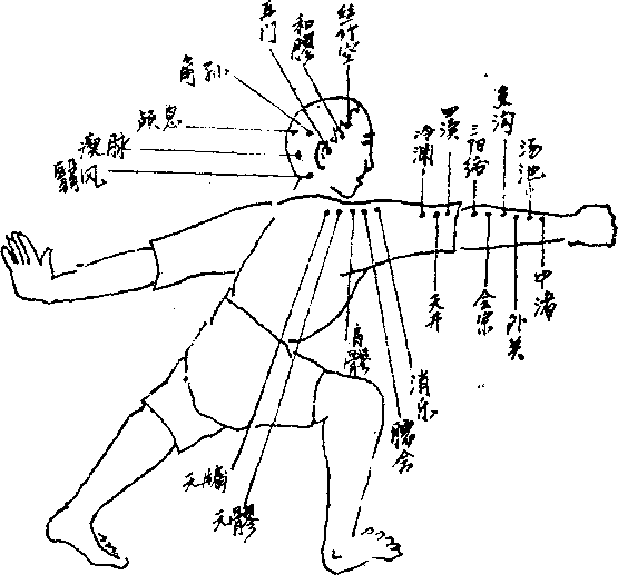 之状态行步如常。细推其理按点擒拿诸法是闭其血液流行之孔道。解法者系于血液来源之处再用拿法决之促其重行流走或于已停之部位重用点法开之使行。世虽有谈其术者余实未尝一见也。故本书于解法则尚付缺如。