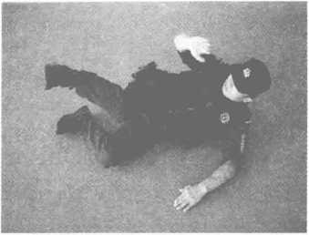 动作要领在戒备姿势基础上用身体一侧的腰、腿着地保护脊柱和头部。左侧身躺在地上左腿弯曲抬起右腿保持蹬踏预备动作。左手掌心向下利用小臂支撑右手弯曲高举过头进行格挡(见图4-18)。(图4-18)