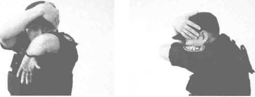动作要领在戒备姿势基础上两臂上提左手呈肘击姿势置于下颌部肘关节向前右手护头收腹含胸下颌微收闭嘴合齿目视前方保持防护状态(见图4-21)。