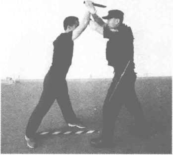 动作要领在戒备姿势基础上当对方攻击我方头部时我方两臂交叉置于头前侧迅速上步向上进行格挡要求两臂肌肉绷紧以增强抗击强度(见图4-26)。
