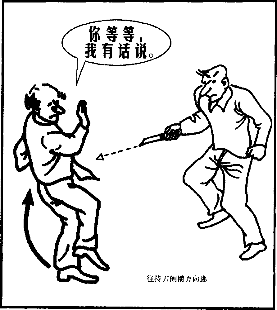 对于刀类的基本防御法是以逃为上策。但是如果背着敌人逃不知甚么时候会被刺上一刀所以还是危险。面对持刀的暴徒你应采取一面向后退一面往横向逃的态势且向暴徒持刀的一旁逃。因为企图用刀刺人时手腕向外刺会比较困难。