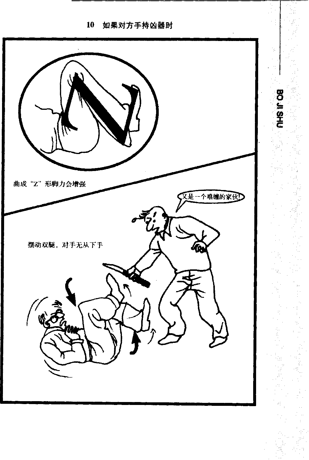 同样说是凶器种类却很多。如果只是拿着石头那和用拳头打过来的情形一样只要技巧地制住对方的手就一点也不可怕。最难应付的是手执利刃的场合要从手执刀的对方保卫自己这就需要你有相当的胆量。