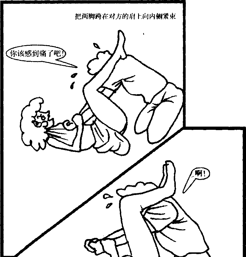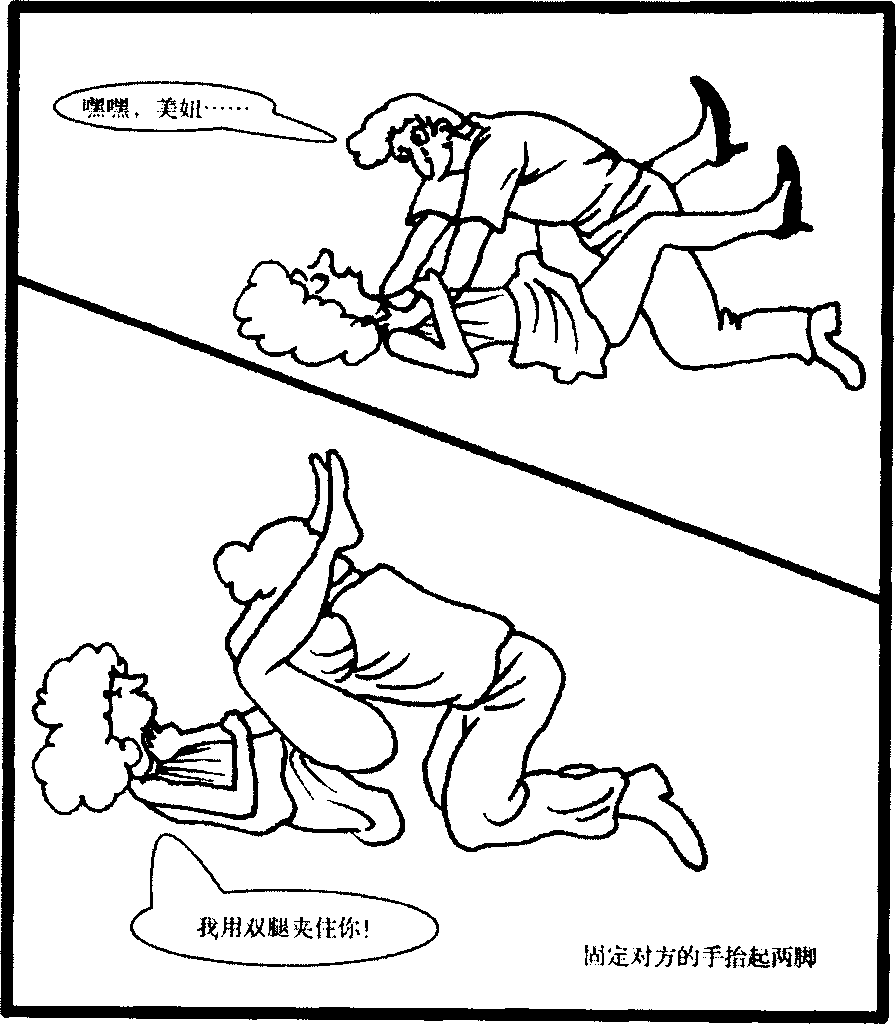 女性遭到卑鄙的色狼突然袭击的可能性也不能完全排除。为了对付危险的场合教她一些防身术也是好事。如果对方是相当凶暴的色狼宁愿采取诱引的形态女性先向地面卧下去。这么一来,色狼会以为有机可乘而向女性骑上来。这时女性要把色狼向自己胸口抓过来的手(一手或两只均可以)抓稳固定然后将两脚搭起来跨在色狼的肩上。到此准备已经完全接下来的动作是将两脚紧锁而胁制色狼的肘同时抬起臂部这时凶暴的色狼必会因胁制的剧痛而投降。这一招对于身体较硬的男性也许做不好但女性是容易施展的这是女性必修的一招。