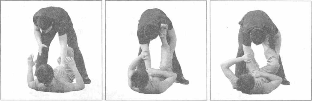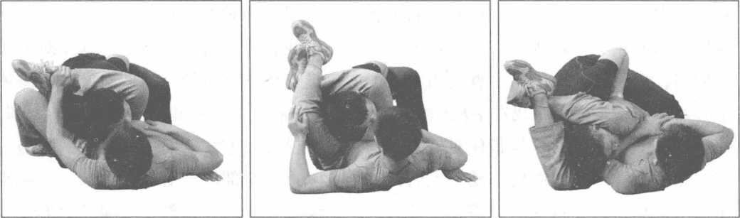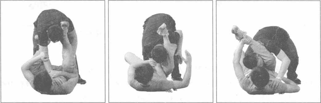 动作要领当我仰卧面对对方时对方想挣脱我的双腿控制用右手抓握我的右衣领时我右手迅速抓握住对方右手腕左手抓压住对方右手肘关节处控制对方身体同时用右脚蹬顶在对方的左肩部。随之我右腿从对方左肩下方紧贴对方颈部伸出双手把对方的右手臂用力向下、向自己身体右侧拉带迫使对方失去身体重心而低头。紧接着我左手从外侧推顶住对方的右大臂右腿紧贴住对方的颈部,控制对方的头部右手拉带住对方右手腕左手松开对方大臂而抓住自己的脚踝关节。然后臀部向右侧略移动一点后整个右腿重心全部压在对方的颈部左腿快速移出与自己的右腿形成搭扣。最后左手继续顶推对方颈部双腿发力形成双腿夹颈绞(图5-2-11-图5-2-19)