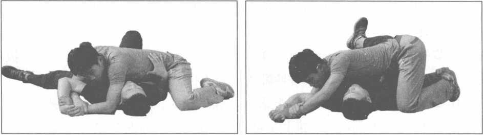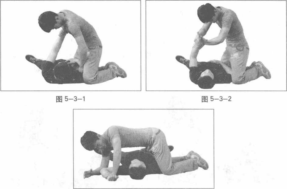 动作要领当对方倒地成仰卧状态时我迅速跪在对方的身体右侧左手压住对方的右肩部当对方利用左手推我胸部时我立刻双手抓握对方的左腕关节。随之,右手向下推压对方的左手臂落地形成反关节左手立即从上方抓握住对方的左手腕关节上体俯卧贴住对方的胸腔部双腿分开保持重心平衡。最后右手从对方左手大臂下方穿过抓握自己的左手腕关节后抬起自己的右手臂形成杠杆作用,迫使对方因左手腕关节剧痛难忍而被制服(图5-3-1-图5-3-5)