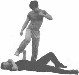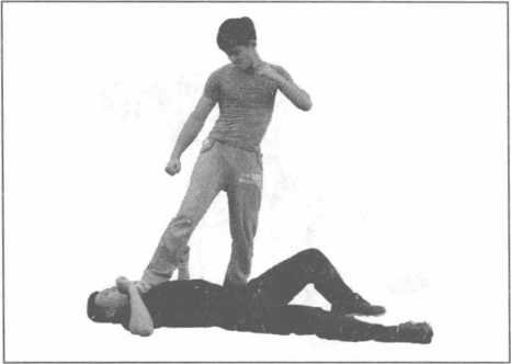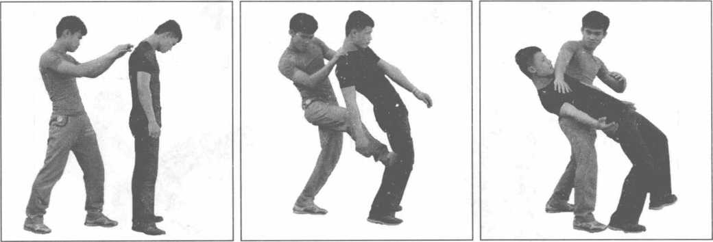 动作过程实战中我悄悄藏于对方身后偷袭时机成熟时突然伸出双手从对方后背抓住对方的双肩并用力向后拉随之右脚快速提起猛力蹬踹对方右腿胴窝部位手继续向后拉带对方的上体脚继续蹬踹对方腿部上下形成一个合力迫使对方仰面倒地倒地后我迅速抬起右脚狠狠向下踩踏其头部或胸腔(图6-3-20-图6-3-24)