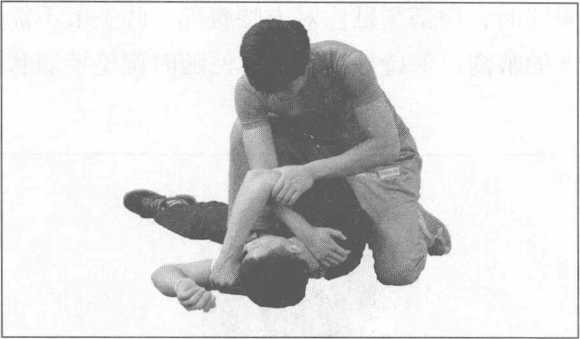 动作要领当对方成侧仰卧状态时我迅速右腿跨过对方的腰部的瞬间右手从对方右手臂下穿插过阻止对方形成俯卧状态。随之双腿下蹲形成一站一跪姿势夹控住对方的腰腹部臀部紧贴住对方侧腰部形成侧骑乘式状态(图5-1-2)