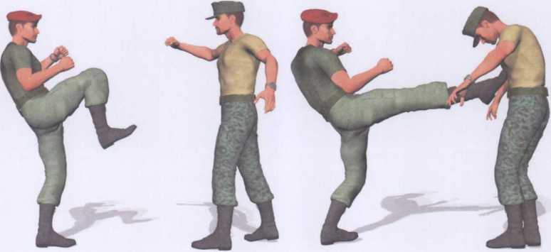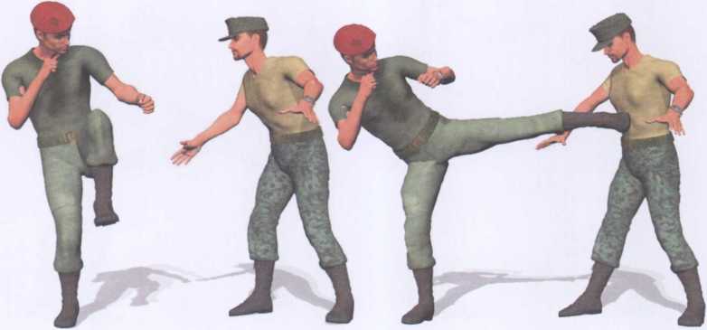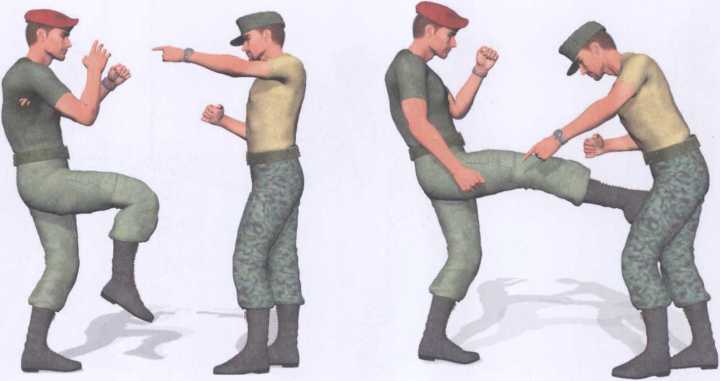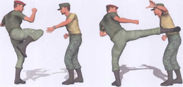 以前踢腿袭击对方腹股沟(图2-2-32、图2-2-33)