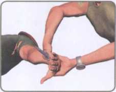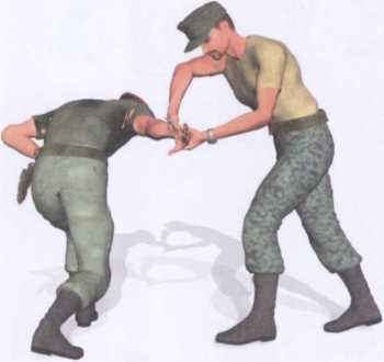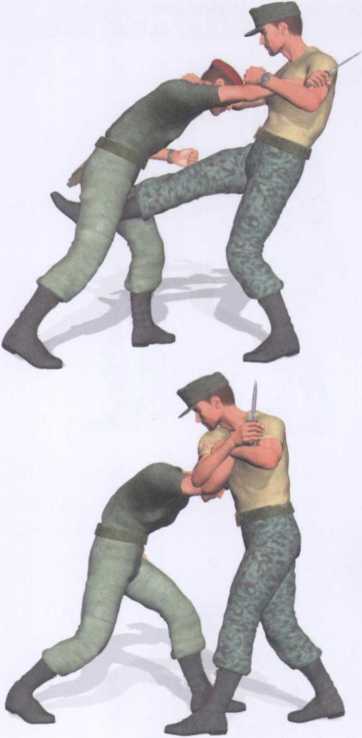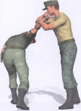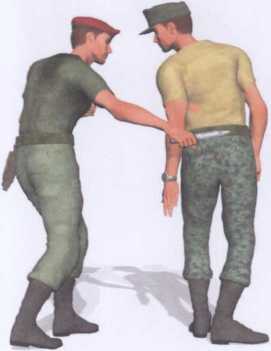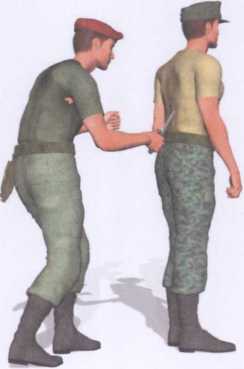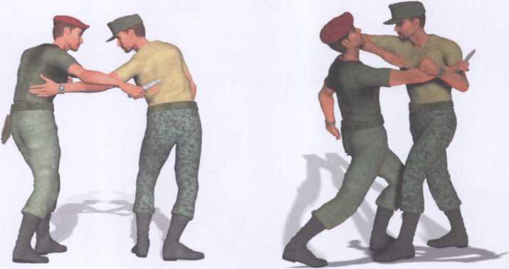 敌人由我身后偷袭右手正握短刀以刀尖抵顶我后腰实施威胁(图4-2-34)